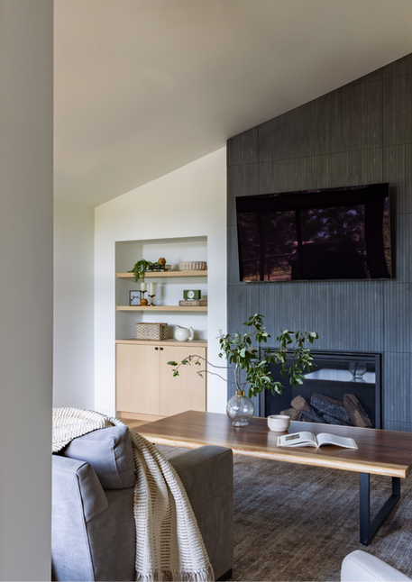 Designed as a gathering place surrounded by nature, this home blends mid-century modern details with warm organic textures. In the kitchen, natural wood tones, a deep green tile, and bold black accents create a space that feels both fresh and timeless.